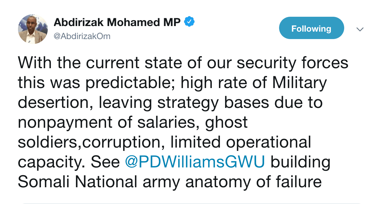 Cabdirisaaq oo hadda ah xildhibaan ka tirsan golaha shacabka ayaa sheegay in marka la eego xaaladda ciidamada amniga Soomaaliya ay haatan ku sugan yihiin in qabsashadan la saadaalin karay.