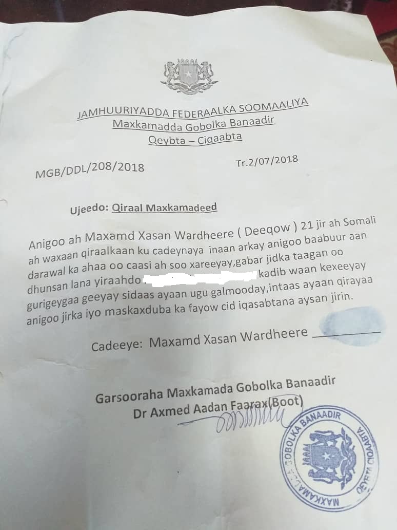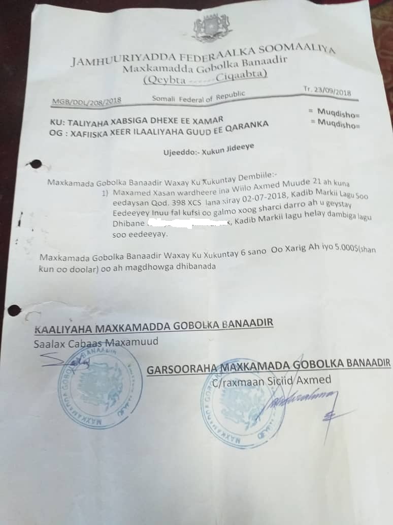Xog: Maxkamada racfaanka G/Banaadir oo $15,000 ku badalatay sii daynta nin kufsi geestay + Caddeyn