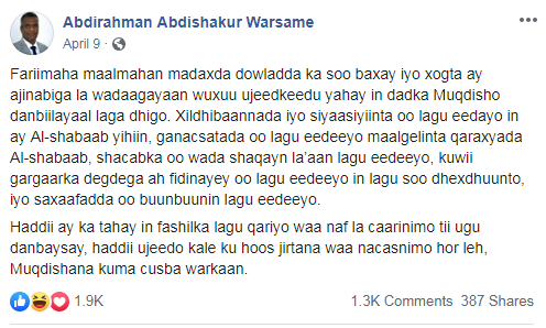 Hase yeesee, waxaan rabaa inaaa dib idin xusuusiyo wixii uu Cabdiraxmaan Cabdishakuur xilligaas kaga jawaabay hadalka Cabdinuur. Wuxuu qoraal uu soo dhigay facebook ku yiri sidan. “Fariimaha maalmahan madaxda dowladda ka soo baxay iyo xogta ay ajnabiga la wadaagayaan wuxuu ujeedkeedu yahay in dadka Muqdisho danbiilayaal laga dhigo. Xildhibaannada iyo siyaasiyiinta oo lagu eedayo in ay Al-shabaab yihiin, ganacsatada oo lagu eedeeyo maalgelinta qaraxyada Al-shabaab, shacabka oo wada shaqayn la’aan lagu eedeeyo, kuwii gargaarka degdega ah fidinayey oo lagu eedeeyo in lagu soo dhexdhuunto, iyo saxaafadda oo buunbuunin lagu eedeeyo.”
