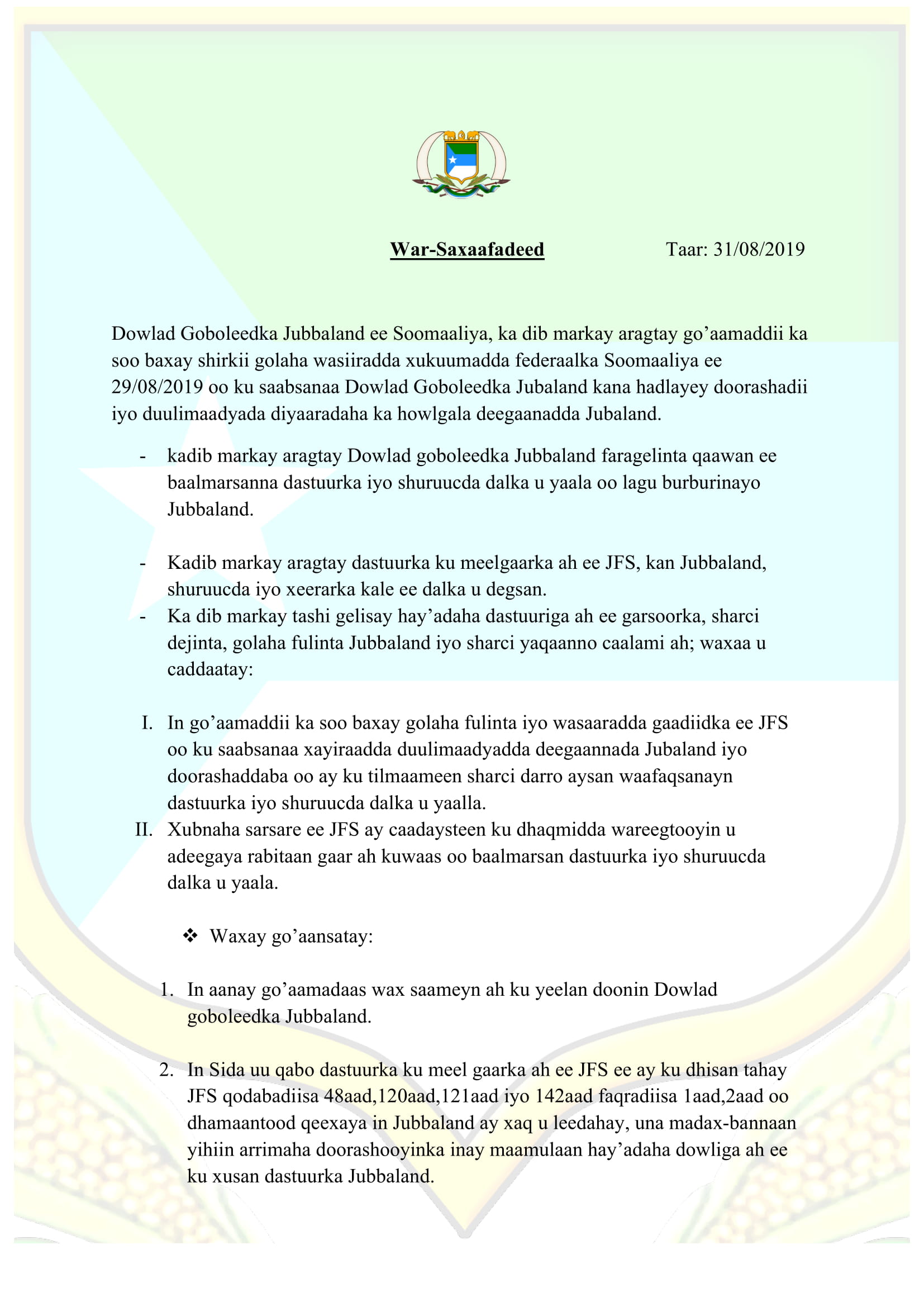 Jubaland oo jawaab culus kasoo saartay go’aankii DF ku xayirtay Kismaayo iyo kii golaha wasiirada