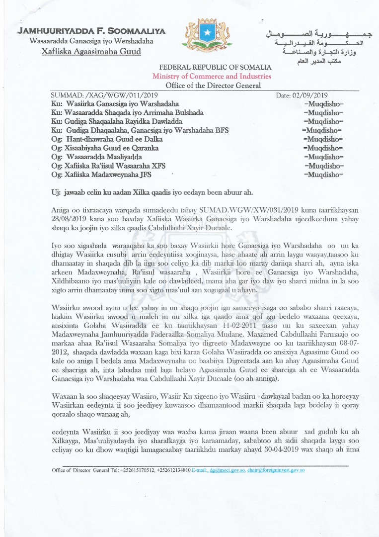 Cabdullaahi Xayir Ducaale ayaa maanta qoraal uu soo saaray ku sheegay in aysan waxba ka jirin shaqo joojintii lagu sameeyay, islamarkaana uusan awood u laheyn wasiirka ganacsiga Soomaaliya in uu shaqo joojin iyo xil ka qaadis ku sameeyo agaasime guud oo ku yimid magacaabis madaxweyne.
