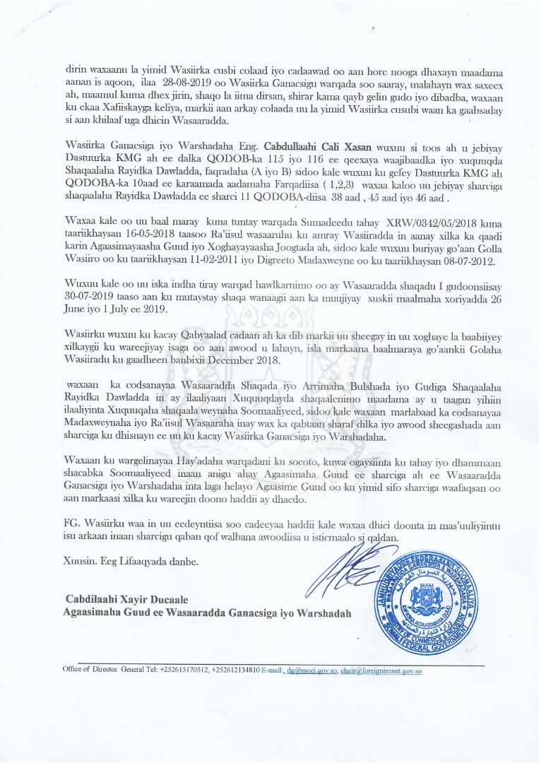 Muqdisho (Caasimada Online) – Agaasimahada guud ee wasaaradda ganacsiga iyo warshadaha Soomaaliya, Cabdullaahi Xayir Ducaale ayaa maanta ka soo horjeestay go’aan xil ka qaadis iyo shaqo joojin ka soo baxday wasiirka wasaaradda ganacsiga iyo warshadaha Soomaaliya Injineer Cabdullaahi Cali Xasan.