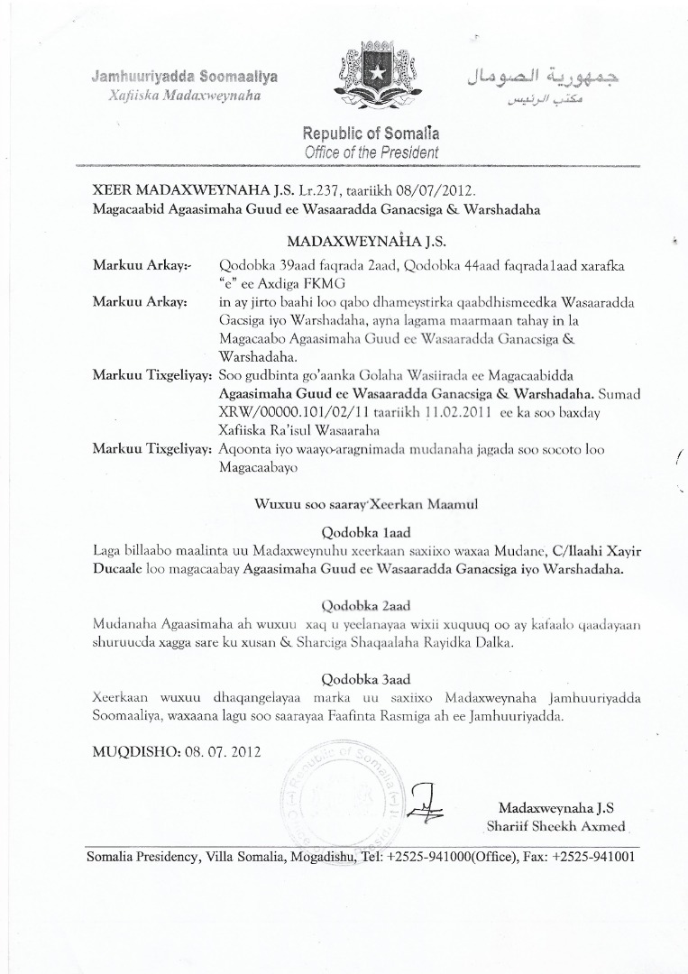 Hoos ka akhriso warqaddii lagu magacaabay agaasimaha guud ee wasaaradda ganacsiga iyo warshadaha Soomaaliya sanadkii 2012-kii, taas oo aheyd magacabis madaxweyne iyo warqadda uu uga soo horjeestay xil ka qaadis iyo shaqa joojintii lagu sameeyay ee uu soo gaarsiiyey Caasimada Online.