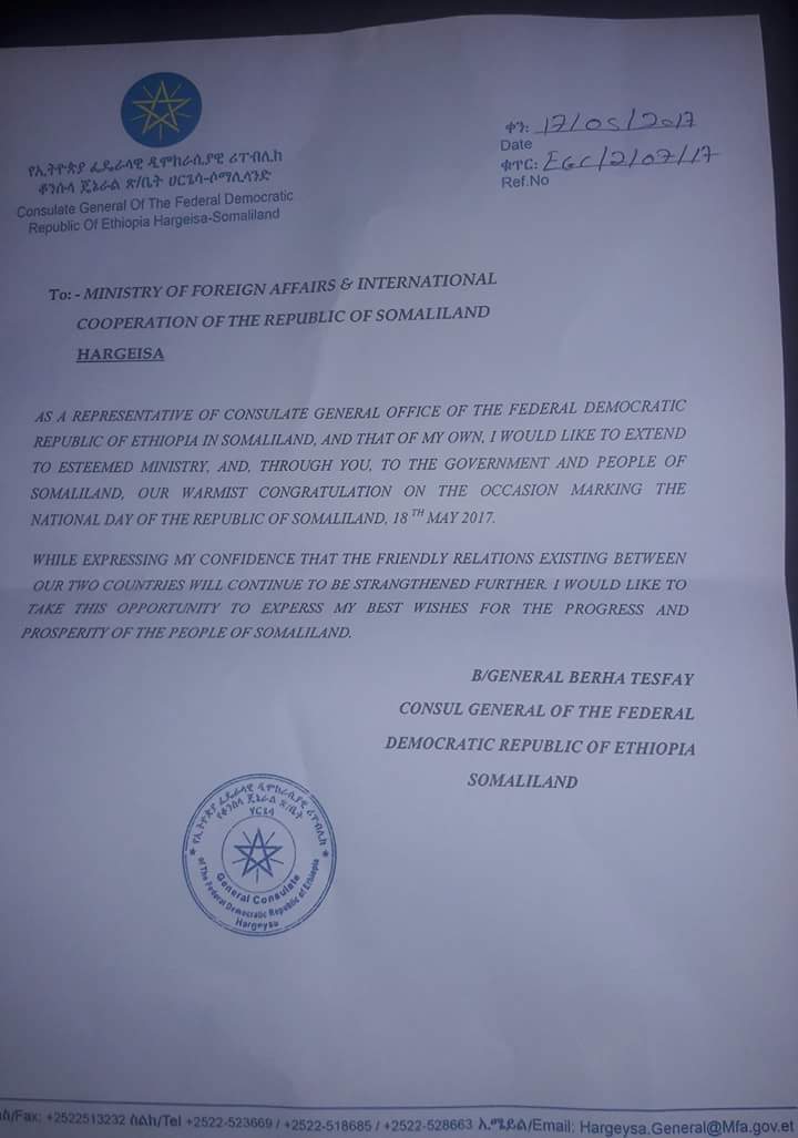 Barwaaqo Posted May 17, 2017 Ethiopia wishes Somalilanders happy independence 18 May. https://pbs.twimg.com/media/DADX6KpWAAUbb1W.jpg:large Quote Share this post Link to post Share on other sites
